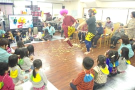 今年も気がつけば2月。3日は春を迎える節分です。 恒例のご近所の保育園児をお迎えして、楽しい節分祭を行いました。 今年も男性スタッフが扮する鬼たちに向かって、利用者も園児もスタッフまでも、ここぞとばかりに豆をぶつけていました。男性スタッフの二人お疲れ様でした。 今回の園児は4月から1年生になる年長さんたちなので、さすが歌や踊りもバッチリ決まってました。もちろん、あんしんの利用者さんも元気さでは負けてはいません。最後まで笑顔いっぱいの節分祭でした。